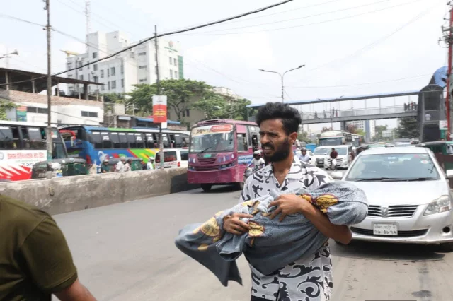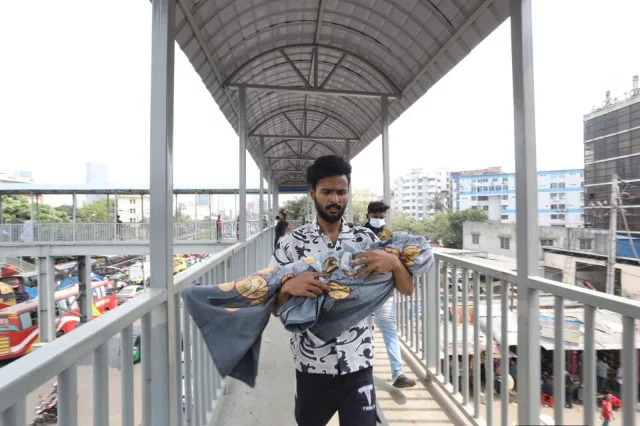 রাজধানীর মহাখালী এলাকায় ফুটওভার ব্রিজ পার হয়ে কোলে শিশুর নিথর দেহ নিয়ে হাঁটছেন এক যুবক- এমন একটি হৃদয়বিদারক দৃশ্য সামাজিক যোগাযোগমাধ্যমে ছড়িয়ে পড়ে।