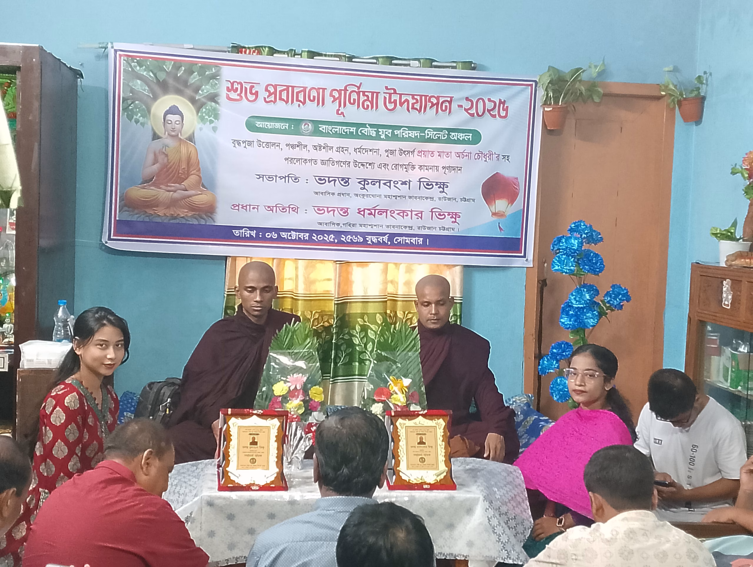 এ উপলক্ষে সোমবার (৬ অক্টোবর) বাংলাদেশ বৌদ্ধ যুব পরিষদ-সিলেট অঞ্চল'র উদ্যেগে নগরীর লামাবাজারস্থ মিয়া ভবনে দিনব্যাপী প্রবারণা পূর্ণিমা উদযাপন ও ধর্মদেশনা অনুষ্ঠানে সুদূর চট্টগ্রামের রাউজান থেকে আগত অংকুরঘোনা মহাশ্মশান ভাবনা কেন্দ্রের আবাসিক প্রধান ভদন্ত কুলবংশ ভিক্ষু'র সভাপতিত্বে অনুষ্ঠিত হয়। এতে প্রধান অতিথির আসন অলংকৃত করেন ভদন্ত ধর্মলংকার ভিক্ষু আবাসিক,গহিরা মহাশ্মশান ভাবনা কেন্দ্র, রাউজান, চট্টগ্রাম।