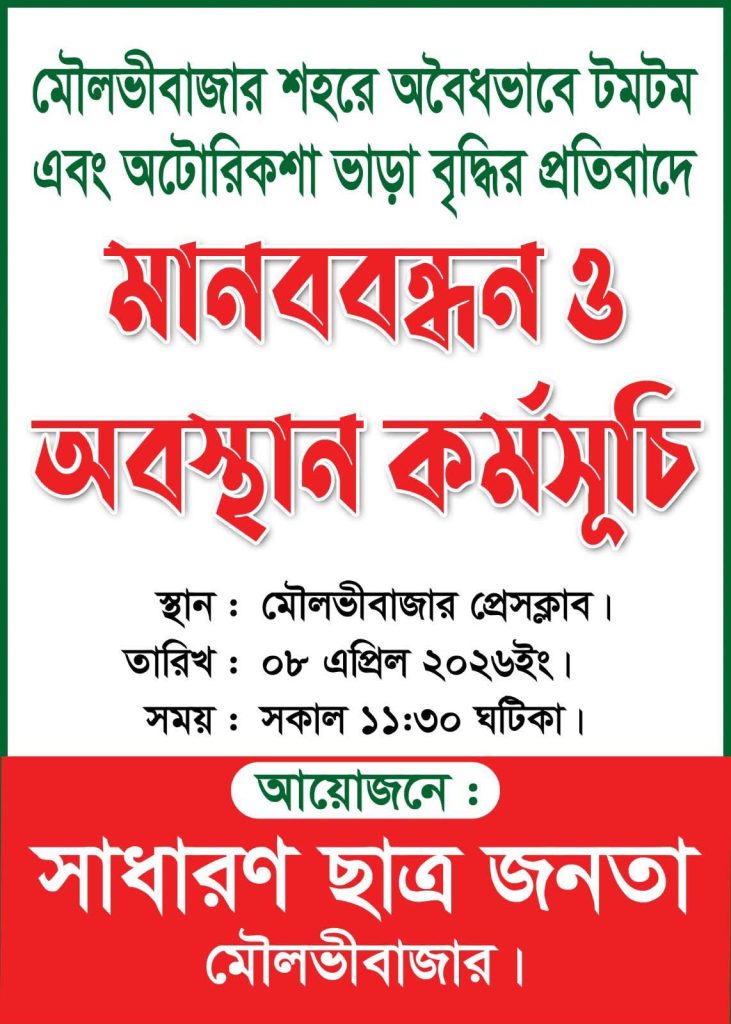 মৌলভীবাজার পৌর শহরে টমটম ভাড়ার নৈরাজ্য; প্রতিবাদে মানববন্ধন ও অবস্থান কর্মসূচি ঘোষণা সাধারণ ছাত্র জনতার