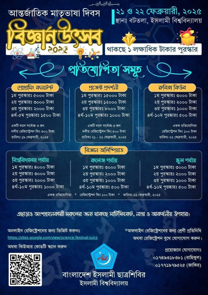 আন্তর্জাতিক মাতৃভাষা দিবস উপলক্ষ্যে বাংলাদেশ ইসলামী ছাত্রশিবিরের ইসলামী বিশ্ববিদ্যালয় (ইবি) শাখার উদ্যোগে অনুষ্ঠিত হতে যাচ্ছে ‘বিজ্ঞান উৎসব-২০২৫’।